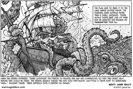I didn’t expect to find illustration and comics on a gallery walk. By chance I wandered into the a post-production video studio called “POSTAGE” at 45 N. Market Street, Suite 1002 in Central Market Mall. I met POSTAGE’s Alex Clements and Joe Krzemienski, who make their own films under the studio name, “The Fictory.” They gave me a poster for their upcoming animated film, Atomic Robo: Last Stop. I found a YouTube trailer for it here. Alex and Joe invited their comic artist friends to set up a mini-comics convention in the hall outside their studio. I met Dominic Vivona who pencils and inks the web comic, Tiegre: East of Warmageddon. The Kraken above demonstrates Dominic remarkable drawing skills. Lancaster, which I had thought of as a pretty old-fashioned city, has clearly got one foot in the future. -K.Mc