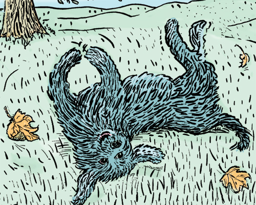 For me, it was fun trying to draw Pavlov as he grew from puppy to adult. Technically, I got to try something different. I sketched in ink on paper until I got the right likeness, then scanned the ink drawing. I open the drawing in Photoshop. There is mode in Photoshop called Multiply. Basically, it makes my ink drawing into layer that can be “back-painted.” I used a Wacom tablet rather than a mouse to lay down the color. The end result is much like an animation cel.