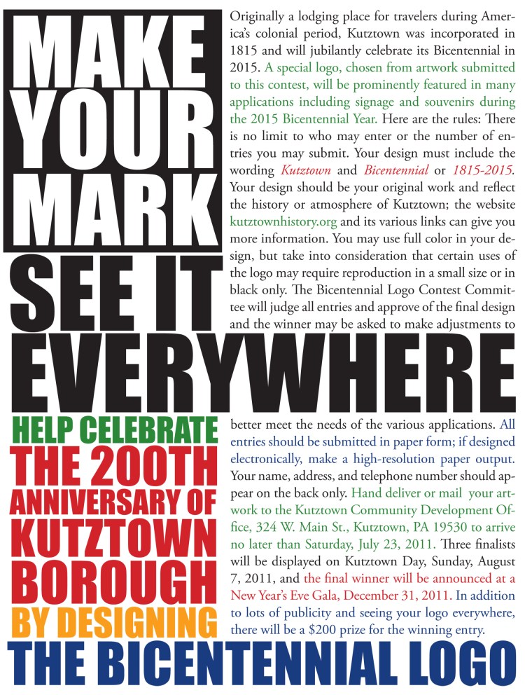 The Borough of Kutztown is gearing up for its bicentennial. There is a $200 prize for a logo to commemorate the town’s 200th birthday. Deadline: July 23, 2011. Prof. Emeritus John Landis made the flyer below which contains all the details. He purposely designed a typographic flyer so as not to suggest a particular visual style for the logo. It can be illustrative, graphic, folkloric, digital, retro, you name it. You are welcome to enter multiple entries and there is no entry fee.