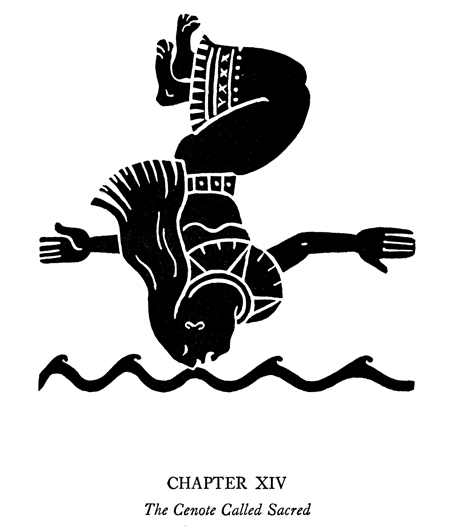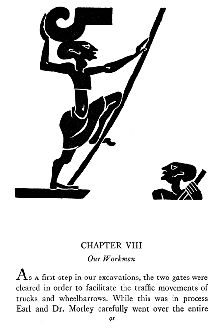 In 1926, Charlot was one of the official artists hired by the Carnegie Institute’s Maya Expedition to document the excavations at Chichen Itza. He later illustrated Ann Axtell Morris’s bestselling book for young adults about that expedition, Digging the Yucatan. The bold silhouette-style illustrations reproduced here are examples of his extraordinary genius. Clearly, the two years he spent in the Yucatan drawing copies of Maya murals and relief sculptures made him the ideal candidate for this assignment. These images are remarkable for their unusual use of white space. I’ve reproduced a few with the text included to give a sense of the book’s dramatic page design.