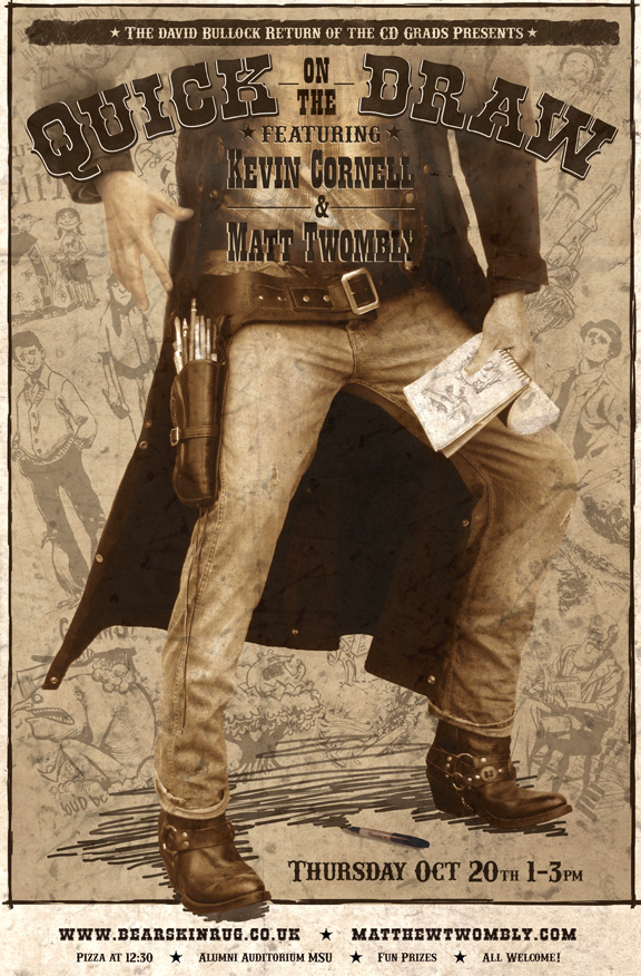 Kevin Cornell and Matt Twombly will present their artwork at “The David Bullock Return of the CD Grads,” Thursday October 20, from 1 until 3pm. Location: Kutztown’s McFarland SUB, Alumni Auditorium. These are two very successful guys who do very different sorts of illustration. Some samples are posted here, but you should really check out their websites, by clicking on their names above.