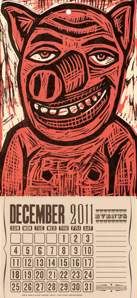 Or maybe save some money to spend at Sean Starwar’s site. The 2012 calendar picks up exactly where my Sean Starwar’s 2011 calendar leaves off. (see below.) Sean Starwars is one my favorite printmakers. Kutztown grad Jason Urban recently featured Starwars year-long printmaking project on the Printeresting site. Starwars grew up in Eastern Pennsylvania, but now lives in rural Mississippi. I’ve met him a few times, and he is the nicest hyper-guy you would like to meet.