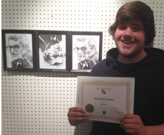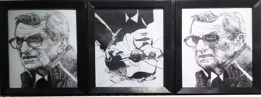 Dylan Rush, 19, a Communication Design sophomore at Kutztown University won Best in Show Award at the 2012 Hazelton Art League Open Exhibition. He drew a series of line art portraits of Joe Paterno in January for his first assignment in Kevin McCloskey’s Illustration Techniques class. Dylan calls the work “Joe Pa.” You will notice the central portrait is upside down and the glass is broken. Dylan explained that in his hurry to frame the artwork, he accidentally broke one of the frames. Dylan decided to hang it broken to conceptually reflect the shattering turmoil at the end of Jo Pa’s life. Note that in the final image Joe Pa has regained his upright direction.