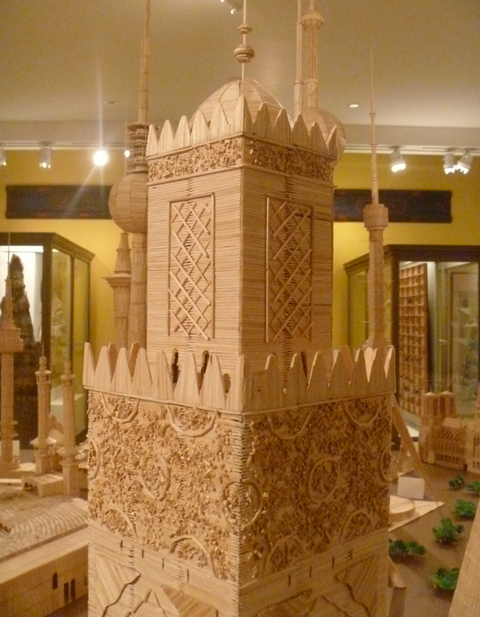Toothpick World opened last week and will be on view at The Reading Public Museum through the end of 2012. There are toothpick towers and temples throughout the museum. The Reading Museum is to be applauded for the brilliant placement of the toothpick St. Peter’s Basilica in front of Tintoretto’s Jesus raising Lazarus. It is inspiring to see the myriad houses of worship side by side. The Little White Wedding Chapel in Las Vegas stands beside Mecca’s Grand Mosque. Jewish, Muslim, Protestant, Catholic, Baha’i, Maya, all coexist peacefully in Toothpick World. Watching Stan build the tower in the lobby I noticed how he controlled his breathing for the delicate placement of each gluey toothpick. His measured breathing is a sort of meditation. His towers, especially his temples, are visible manifestations of his meditations. Is it too much of a leap of faith to call these towers visible prayers?