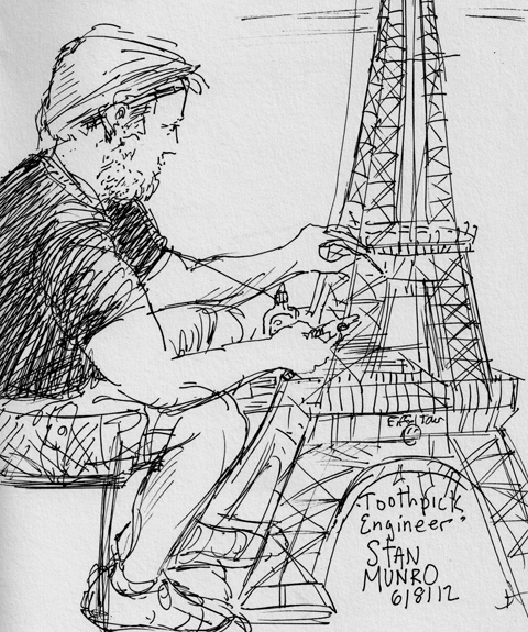 I met Stan Munro at the Reading Museum. He is an interesting guy. He was seated in the center of the museum’s lobby with a case of toothpicks and a container of Elmer’s glue. He was building the Eiffel Tower.