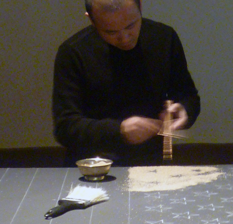 Jiawei Gong made an American flag from sugar at the Reading Public Museum. This art work, created in early June, will be on view until July 8. Tibetan monks traditionally use colored sand to create mandalas, often composed of circular shapes based on Buddhist cosmology. Jiawei is not a Tibetan monk, he is a Chinese-born Professor of Fine Art at Kutztown University. This is not a traditional mandala, nor a traditional stars and stripes. The 50 stars are white sugar. Dark and light brown sugar replace the blue field and red stripes.