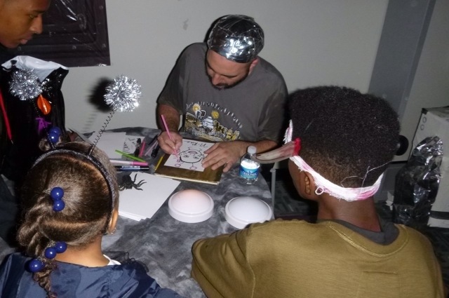 Meet Nils Balls. He is the guy wearing a tin foil helmet in the Carnegie Library on Pittsburgh’s Northside. He’s seated with a fairy princess and a teen zombie who has a knife through his head, drawing free caricatures for the Library’s Halloween Party.
