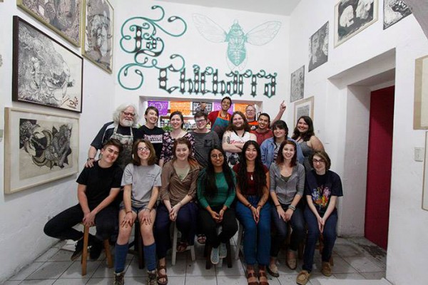 Next Image 10532876_668492823261757_4844051749176020289_n Edith Chavez, center front, and Alan Altamarino, center back with KU students at Taller Chicharra.