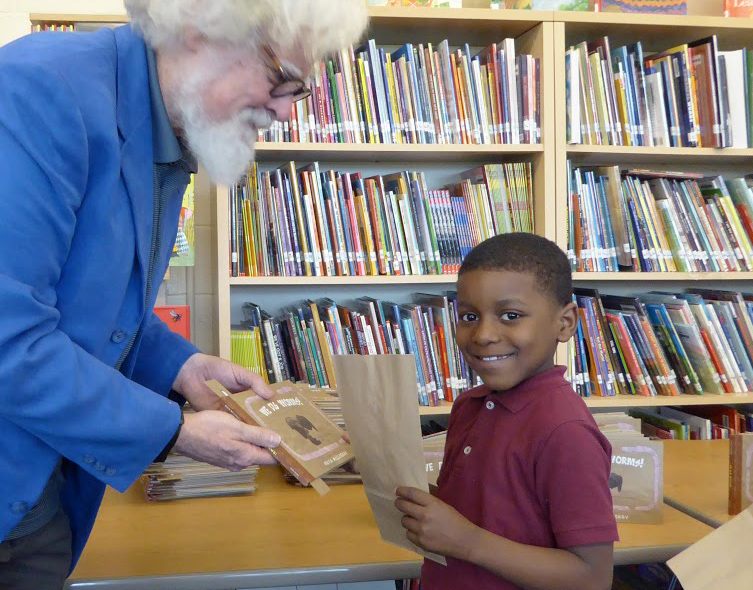 150 children showed up at Politics and Prose Bookstore for Earth Day in Washington, D.C. The crowd went wild when a large nightcrawler got out of the bucket and hit the carpet. After that bookstore event, An Open Book Foundation brought me to visit an inner city school, Simon Elementary. Thanks to the generosity of Simon’s “Book Buddies” outreach program of the Washington Hebrew Congregation, each of the nearly 90 children I met there got a copy of my book. We sang “Happy Earth Day” to the worms. It was sweet.