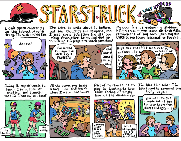 Here is a great illustrated article about roller derby culture. And acclaimed autobiographical cartoonist Lucy Knisley, while not a derby skater herself, perfectly captures the feeling of giddy fandom that characterizes many women’s first taste of the sport with her comic, Starstruck.