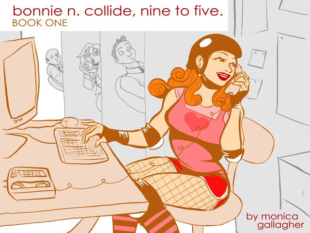 And Monica Gallagher’s ‘Bonnie n Collide: Nine to Five’, is ongoing strip webcomic, also collected in print form, about a derby girl working a desk job. It’s a funny, goofy and larger-than-life play on the idea of a double life (also featuring werewolves and in-office booty blocking) – but there are some lovely and very true to life interactions with Bonnie’s team and league, threaded through amongst the wacky hijinks.