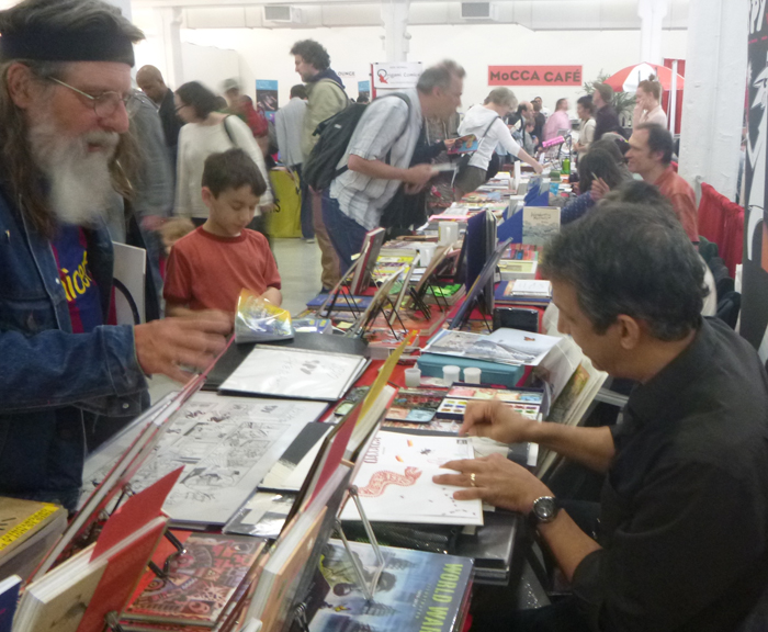 Most recently I saw him at the MoCCA Fest last April in NYC. He showed me pages of original art from Ruins, a new work about Oaxaca. I asked how Ruins differed from Diario de Oaxaca? “It’s fiction, based on my experience, being in Oaxaca in 2006, but it’s fiction, ” he said. “See the VW beetle cab? You and I know they don’t have VW cabs in Oaxaca, but they are so much fun to draw!”