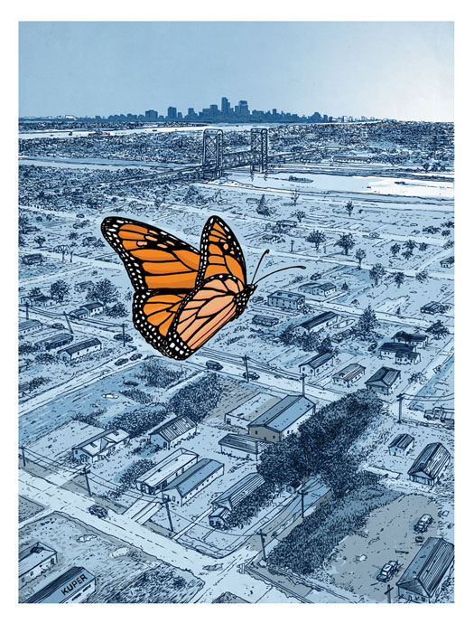 Taken alone Kuper’s suite of drawings of the Monarch butterfly’s annual migration could be a stunning book in itself. He is not the first to use the Monarch as a graphic metaphor for open migration and the unnatural concept of borders. Oakland’s Dignidad Rebelde and Pittsburgh’s JustSeeds have published posters in a similar vein. But Kuper composes a lyrical visual essay on the Monarch. It is a spectacular display of graphic art.