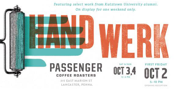 hwerkI’ve only been to First Friday in Lancaster once, but I am going again on Oct 2. It should be great. Ryan Smoker and Ryan Martin of Infantree are putting together a pop-up show at Passenger Coffee Roasters. The posters are by grads of Kutztown’s Communication Design Dept. I got a preview of some of the work in Prof. Karen Kresge’s flat file. I wrote to handful of the artists, Brian Barto got back to me.