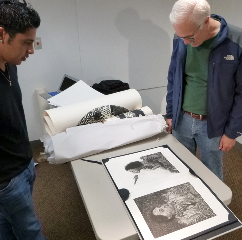 Today I spent the day with Alan hanging his large-scale wood block prints in the Student Gallery in Sharadin. When printmaking Prof. Evan Summer visited, Alan shared a portfolio of etchings based on indigenous Zapotec cosmology. Even these etchings portrayed the cardinal elements: Earth, Wind, Water, and Fire as women.