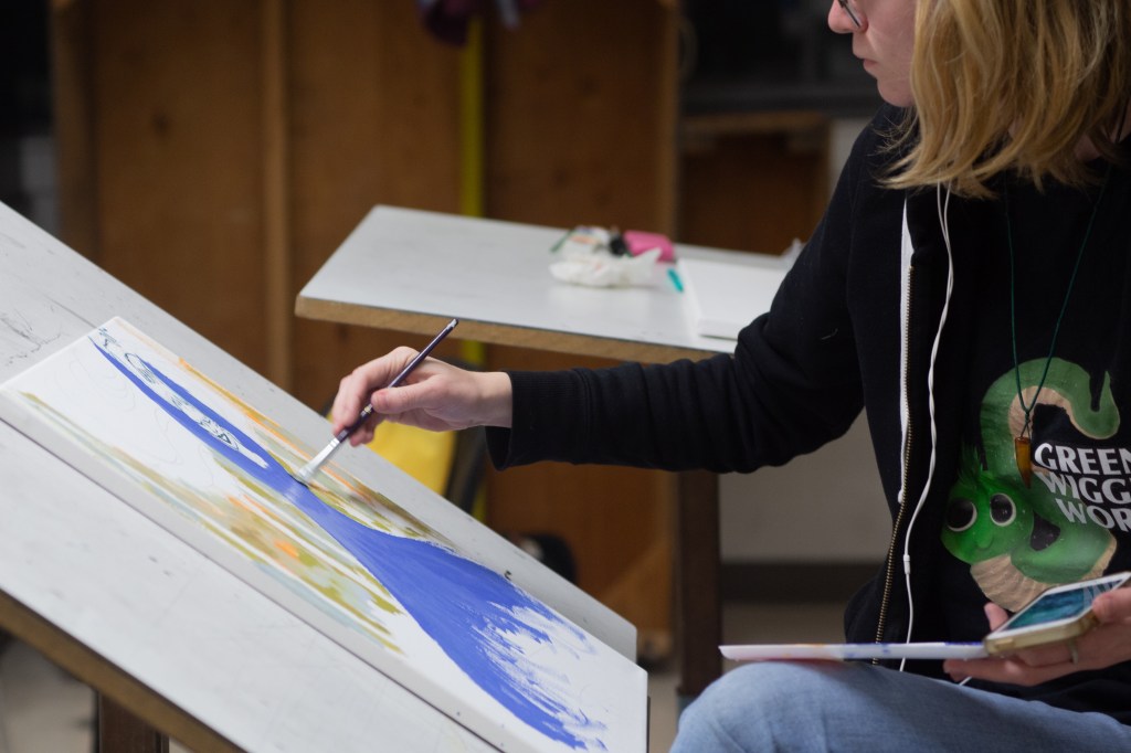 Prof. Ann Lemon guided the student artists in reflection on their family and friends. She asked them to recall someone close who had been harmed by substance abuse. She led a brief meditation on loss and inspiration. Then fifty student artists competed against each other and against time to create a piece of art delivering a positive message.