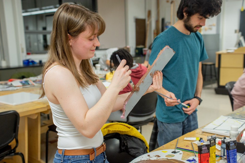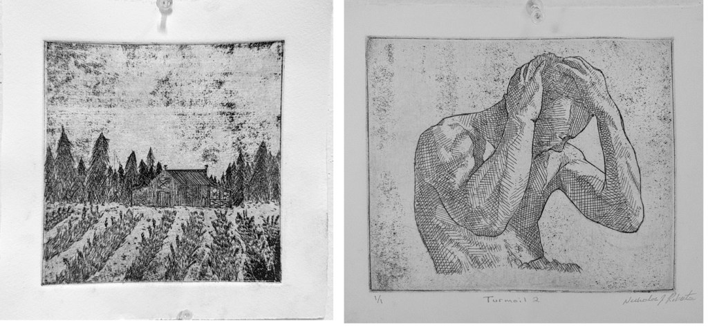 A few students went down to the printmaking studio and managed to produce stunning etchings within the 90-minute time constraint. Erin McKormick’s landscape, left, won for Innovative Printmaking. Nick Roberts’ figurative work, right, won the Blick Technical Ability Award.