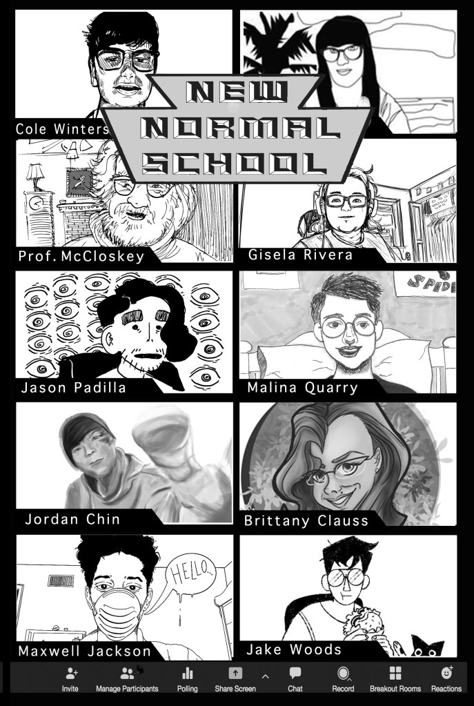 CDE 253, Illustration 2: The class is making zines this semester. We got a table at MoCCAfest, the giant indy comic book festival in New York City. We were going to hop on the bus and show our stuff, but the Society of Illustrators postponed MoCCAfest. These students were doing extraordinary work so the change of plans was disappointing. The class meets via ZOOM now. We came up with a new assignment: Here are some reflections on the New Normal.