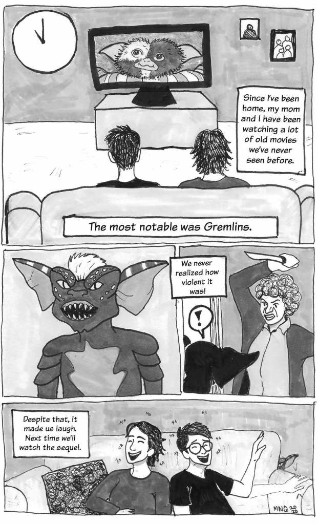 Cole Winters is a Communication Design major at Kutztown, concentrating in Illustration. He cannot get enough of giant robots, monsters, and loves horror to death. He drew a story about his last meal at a restaurant before quarantine. He went for the DA-BOMB hot wings.