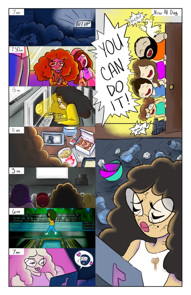 Comic below is by an aspiring animator, Alana Hernandez. She writes, “I am currently a senior at Kutztown University studying to get a Bachelor’s Degree in Applied Digital Arts. Here’s how my life has changed from living on campus to taking classes digitally from home.” Her Instagram – @alamallana