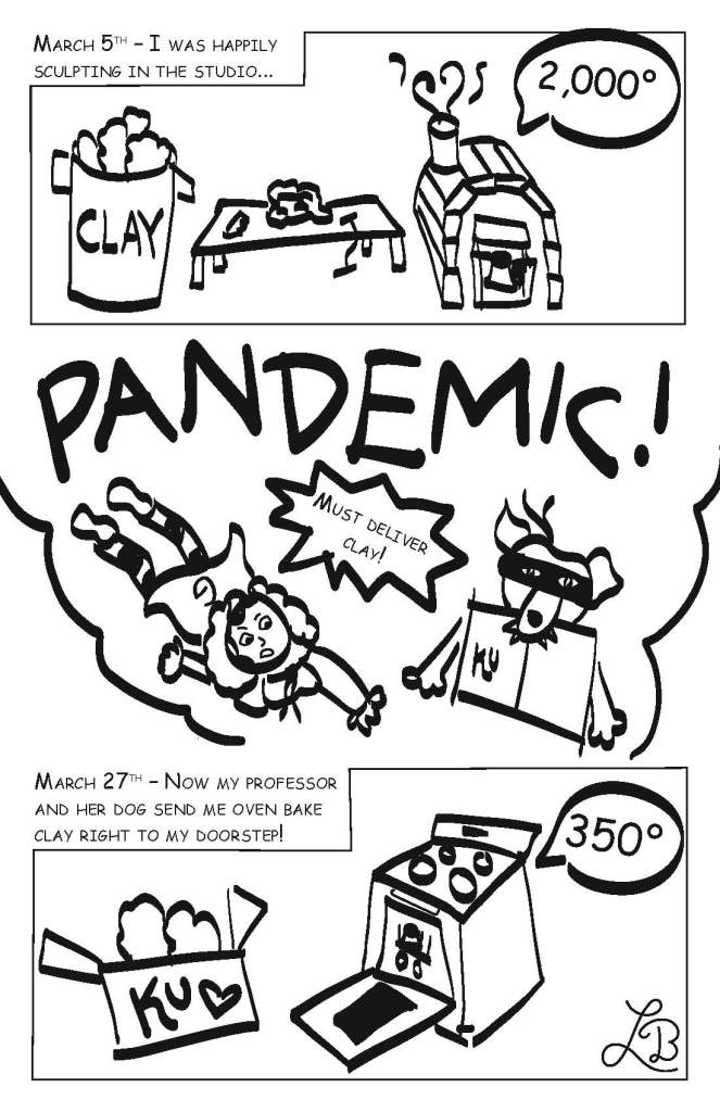 Lindsey Brown writes, “My name is Lindsey and I live alongside the Amish in Lancaster, PA. Currently I’m a junior at Kutztown University pursuing a degree in Communication Design. When I’m not creating logos or magazines I really enjoy sculpting with ceramics, check out my work 🙂” Lindsey’s drawing shows the superhuman effort Professor Gwendolyn Yoppolo went to in order to save her ceramics course.