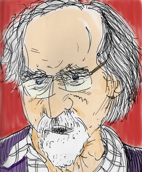 I’d heard many of his one-liners in class. Still, it was great to hear him again at Lehigh. I brought my camera, but just as they dimmed the lights there was a “No cameras, No recording devices!” announcement. Luckily, I had my Moleskine sketchbook, which is a permissible sort of recording device, I suppose. I took notes of his comments and did the quick sketch above. I added color in Photoshop at home.